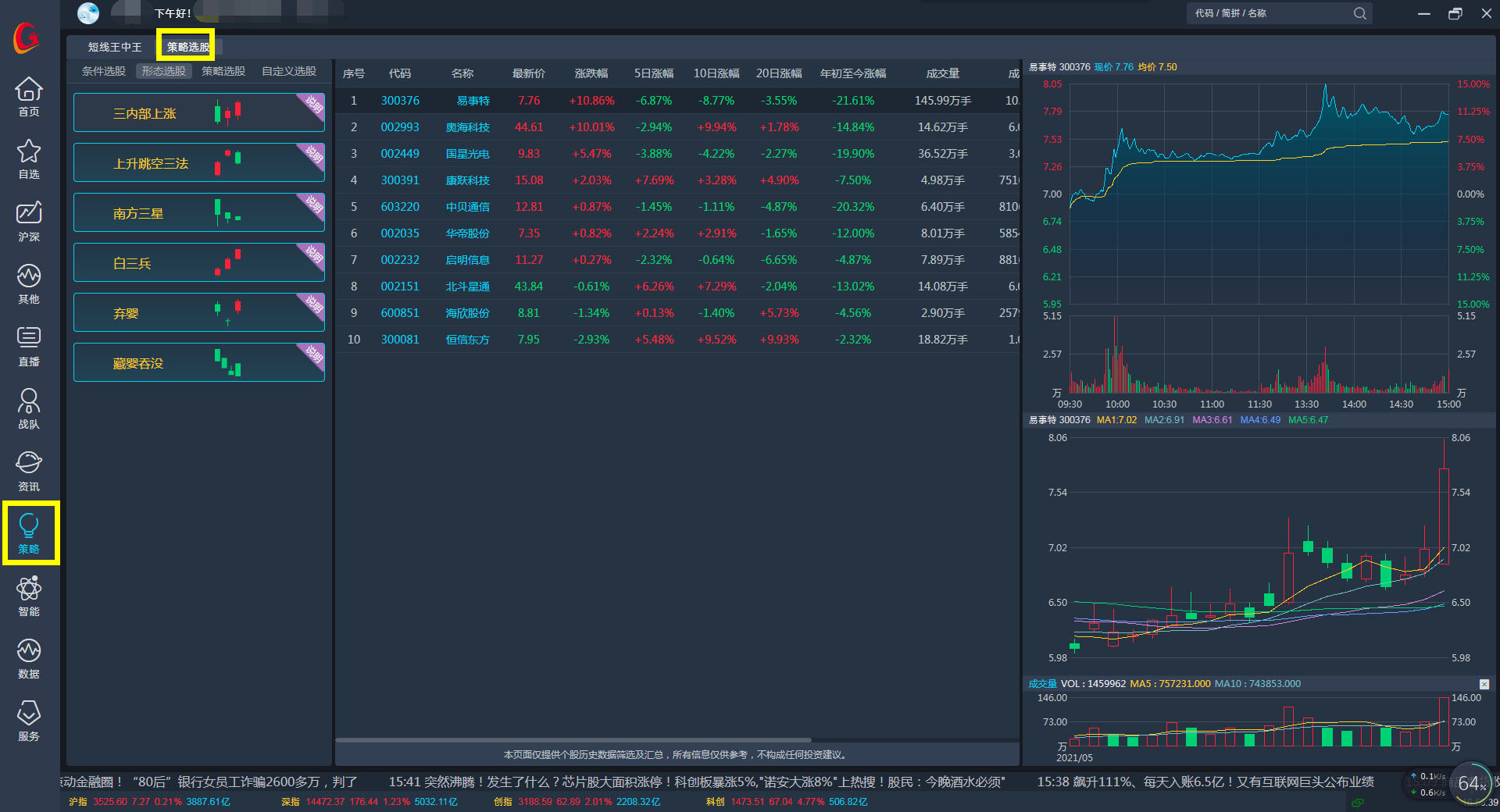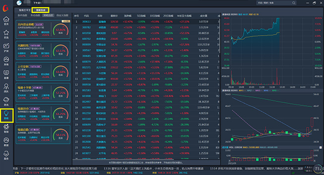 经典的选股、监控工具,结合了传统条件选股和预警系统的优点,检具动态筛选能力,专业投资者的明智之选,挖掘市场热点结合个股基本面和资金数据进行分析,运用当下赚钱效应最稳定、最快捷的技术战法选股,追求高准确率下的短线复利性收益。